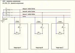 - Например, в первую квартиру подводится фаза «A», во вторую квартиру — фаза «B», в третью квартиру — фаза «C» и так далее…