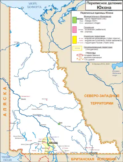 Статистическая служба Канады рассматривает территорию Юкон единой переписной областью, разделённой на переписные подобласти[1]. Девять видов переписных подобластей Юкона можно разделить на муниципальные образования (англ. City, англ. Town, англ. Village), поселения без муниципального статуса (англ. Hamlet, англ. Settlement / Établissement), индейские резервации (англ. Indian reserve / Réserve indienne, англ. Indian settlement / Établissement indien, англ. Teslin land)[2] и неорганизованные области (англ. Unorganized / Non organisé)[3]. Ниже представлены списки всех муниципальных образований, поселений, индейских резерваций и неорганизованных областей территории Юкон с информацией о численности населения и площади занимаемой территории по данным переписи населения 2006 года[1].