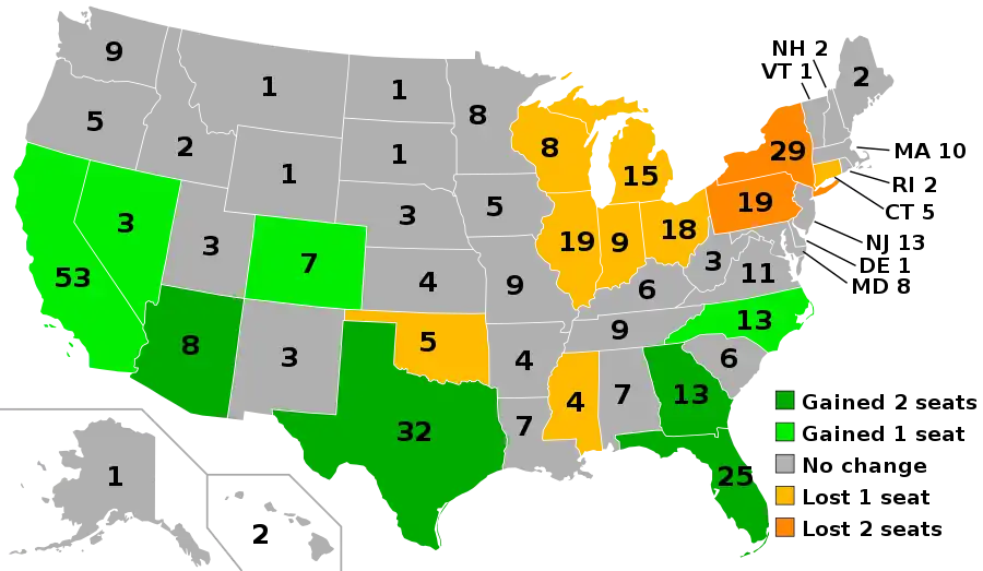 В соответствии с результатами переписи состоялось частичное перераспределение мандатов, выделяемых штату в зависимости от численности населения[6], в нижней палате Конгресса США — Палате представителей. 18 штатов изменило, по решению Бюро переписей населения, своё представительство в высшем законодательном органе Соединённых Штатов: 10 штатов потеряло представителей, тогда как 8 других — увеличило их число. Аризона, Техас, Джорджия и Флорида получили сразу по 2 дополнительных места в Конгрессе, в то время как Нью-Йорк и Пенсильвания утратили по 2 мандата. Как отмечается в отчёте о перераспределении мест в Палате представителей, представительство северных штатов в американском парламенте с каждой переписью сокращается[7]. С изменением количества представителей в нижней палате Конгресса связан инцидент, выявивший противоречие в избирательной системе по вопросу, считать ли религиозных миссионеров (в частности, из мормонов), то и дело покидающих территорию США, постоянными жителями, количество которых влияет на состав Палаты представителей, или нет[8][9].