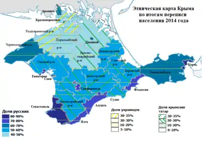 19 марта 2015 года стали известны некоторые статистические данные, касательно национального и языкового состава населения полуострова. По сравнению со всеукраинской переписью населения 2001 года увеличилась численность русских на 2,7 %, армян — на 9 %, а численность украинцев сократилась на 40 %, белорусов — на 38 %.
