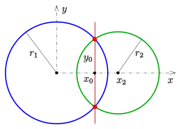 Особый случай ; в этом случае начало координат — это центр первого круга, а второй центр лежит на оси абсцисс (см. диаграмму[уточнить]). Уравнение радикальной прямой упрощается до: а точки пересечения можно записать как с
