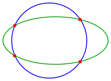 Задача пересечения эллипса, гиперболы, параболы с другим коническим сечением сводится к системе квадратных уравнений, которую в частных случаях легко решить, исключив одну координату. Специальные свойства конических сечений могут быть использованы для получения решения. В общем, точки пересечения могут быть определены путём решения уравнения с помощью итерации Ньютона. Если а) обе коники заданы неявно (посредством уравнения), необходима двумерная итерация Ньютона; б) одна неявно, а другая параметрически — необходимо, чтобы была задана 1-мерная итерация Ньютона.