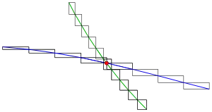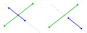 Для двух непараллельных линейных отрезков и эта точка не обязательно является точкой пересечения (см. диаграмму), потому что точка пересечения соответствующих линий не обязательно должна содержаться в линейных отрезках. Для проверки ситуации используются параметрические представления линий: