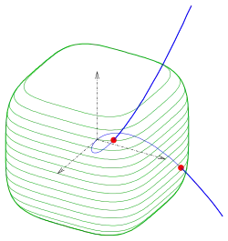 - Точки пересечения: (−0.8587, 0.7374, −0.6332), (0.8587, 0.7374, 0.6332).