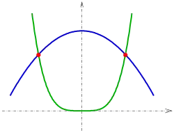 - Точки пересечения: (−1.1073, −1.3578), (1.6011, 4.1046)