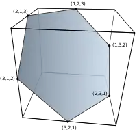 - Перестановочный многогранник имеет одну гипергрань для каждого непустого собственного подмножества S множества {1, 2, 3, …, n}, состоящую из всех вершин, у которых все координаты с номерами, вошедшими в S, имеют меньшие значения, чем все координаты с номерами, не вошедшими в S. Отсюда следует, что общее число гиперграней равно 2n − 2.