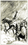 «На девятый день достигли они альпийского перевала, часто пролагая себе путь по непроходимым местностям и несколько раз сбиваясь с дороги: то их обманывали проводники, то они сами, не доверяя им, выбирали путь наугад и заходили в глухие долины. В продолжение двух дней они стояли лагерем на перевале; воинам, утомленным работами и битвами, было дано время отдохнуть; а несколько вьючных животных, скатившихся прежде со скал, ступая по следам войска, пришли в лагерь. Воины все еще были удручены обрушившимися на них несчастьями, как вдруг, к их ужасу, в ночь заката Плеяд выпал снег. На рассвете лагерь был снят и войско лениво двинулось вперед по дороге, на всем протяжении занесенной снегом; у всех на лице лежал отпечаток тоски и отчаяния».