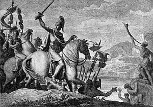 Он еще колебался, как вдруг ему явилось такое видение. Внезапно поблизости показался неведомый человек дивного роста и красоты: он сидел и играл на свирели. На эти звуки сбежались не только пастухи, но и многие воины со своих постов, среди них были и трубачи. И вот у одного из них этот человек вдруг вырвал трубу, бросился в реку и, оглушительно протрубив боевой сигнал, поплыл к противоположному берегу. "Вперед, — воскликнул тогда Цезарь, — вперед, куда зовут нас знаменья богов и несправедливость противников! Жребий брошен"»[6]