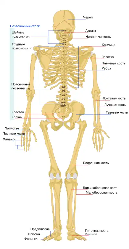 Скелет взрослого человека состоит из около 206-208 костей: 23 костей образуют череп, 33 — позвоночный столб, 25 — ребра и грудину, 64 — скелет верхних конечностей, 62 — скелет нижних конечностей.