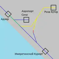 - Адлер — направления Сочи (DC) — Имеретинский курорт (DC)/Роза Хутор (AC). Также в границах узла треугольника нейтральная вставка находится в кривой на Розу Хутор со стороны Имеретинского курорта.