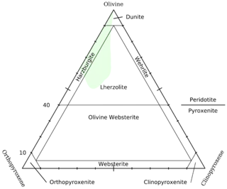 - Лерцолит: оливин — 40-90%, ортопироксены — 10-50%, клинопироксены — 10-50%