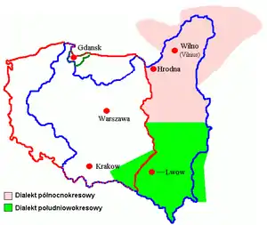 - Различие в характере полонизации территорий распространения кресовых диалектов, значительно больший приток полоноязычного населения на территорию Украины, чем на территорию Великого княжества Литовского, и соответственно большее влияние на язык южных Кресов польских говоров (малопольского диалекта), что приближает южнопериферийные говоры по характеру своего формирования к переселенческим говорам[13]. Северо-восточный диалект тесно связан с северо-западными диалектами белорусского языка, в ряде случаев сложно разграничить белорусские и польские говоры, особенно в свете наличия большого числа людей с польским самосознанием и родным белорусским языком.