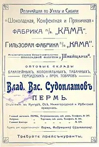 В. В. Судоплатов построил фабрику «Кама», выпускавшей пряники, баранки, карамельные конфеты, монпансье, ирис.