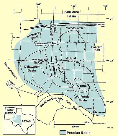 Пермский бассейн — крупный нефтегазоносный бассейн осадочного типа в юго-западной части США. Расположен на территории западного Техаса и на юго-востоке штата Нью-Мексико. Простирается от Лаббока, далее вблизи Мидленда и Одессы. Далее на юг до реки Рио-Гранде и на запад в юго-восточную часть штата Нью-Мексико. Содержит одно из самых мощных в мире отложений горных пород пермского геологического периода. Состоит из нескольких составляющих, из которых самым крупным является бассейн Мидленд, за которым по размеру следуют бассейн Делавэр и бассейн Марфа. Пермский бассейн охватывает площадь более 86 000 квадратных миль (220 000 км2)[1] и простирается примерно на 250 миль (400 км) в ширину и на 300 миль (480 км) длину[2].