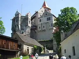 Само же название замка и, соответственно, предикат рода — Пернштейн — произошло, вероятно, от его первоначально немецкого наименования Bärenstein — «Медвежий камень»[5].