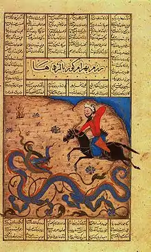 Бахрам Гур, убивший волка. Миниатюра. «Шахнаме Демотта» 1328-1336 годы. Кембридж, Музей Фогга