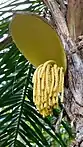 Цветки мелкие, желтовато-белые, мужские и женские собраны вперемешку в кисти длиной до 30 см, расположенные под самой кроной пальмы.
