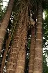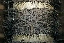 Прямая стройная пальма высотой 20—30 метров. Ствол по всей его длине или только в верхней части охватывают широкие кольца длинных (до 12 см) чёрных иглообразных колючек, сильно затрудняющих сбор урожая.