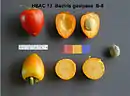 Плоды, жёлтого, оранжевого или красного цветов, висят гроздьями по 50—100 штук. Они чашевидной, конической или овальной формы, длиной около 6 см, со слабо выраженными шестью гранями. Под тонкой кожицей находится сладкая мучнистая жёлто-оранжевая мякоть и крупная яйцевидная косточка с острой верхушкой. Название плода дано по сходству цвета с персиком, а не по вкусу, который сухой и мучнистый, может быть сравнён с каштанами с сыром.