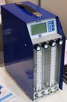 Поэтому анализ количества вредного вещества, задержанного фильтром респиратора (массы пыли на противоаэрозольном фильтре[24] и количества газа в противогазном фильтре), позволяет оценить количество вредного вещества, которое могло бы попасть в органы дыхания при работе без средств индивидуальной защиты. Между персональным пробоотборником и респиратором есть значительное отличие — у первого расход воздуха постоянен и измеряем, что позволяет определить среднюю за замер концентрацию; а у второго не постоянен, и обычно не измеряется, что не позволяет определить концентрацию. Однако риск развития профессиональных заболеваний часто определяется не столько концентрацией, сколько дозой, общим количеством попавших в организм вредных веществ. А персональный пробоотборник не измеряет дозу — её можно лишь приближённо вычислить, если можно оценить потребление воздуха рабочим. В работе[25] предлагалось установить расходомер между фильтром и маской для устранения указанного недостатка.