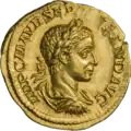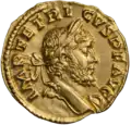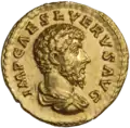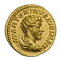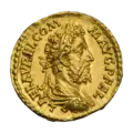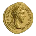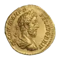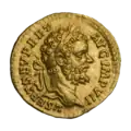 Ауреус. Септимий Север. Аверс. (аверс). Голова Септимия Севера в лавровом венке, вправо.