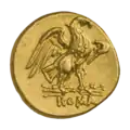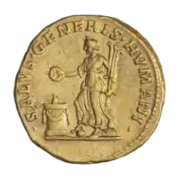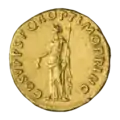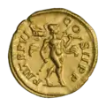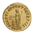 Ауреус. Реверс. Салюта стоит со скипетром в руке, кормит из патеры обвившую алтарь змею.