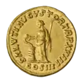 Ауреус. Реверс. Салюта в правой руке держит патеру и кормит обвившую алтарь змею