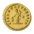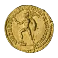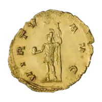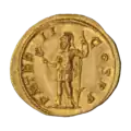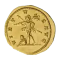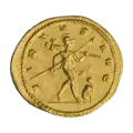 Ауреус. Реверс. Виртута в шлеме стоит, влево; в правой руке Виктория