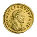 Аврелиан (270—275). Ауреус. Рим. Аверс. Бюст Аврелиана в панцире, вправо; на голове лавровый венок.