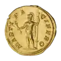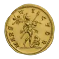 Галлиен (253—268). Ауреус. Ок. 261 г. Рим. Реверс.Марс стоит, влево; в руках глобус и скипетр.