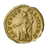 Ауреус. Фаустина Младшая (реверс). Салюта сидит на троне