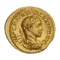 Ауреус. Рим. Аверс. Бюст Севера Александра в панцире и плаще, вправо; на голове лавровый венок.