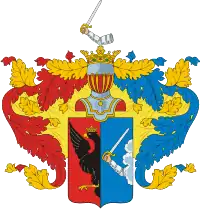 Щит разделён перпендикулярно надвое, в правом красном поле изображён до половины вылетающий с правой стороны чёрный орёл в короне с распростёртыми крыльями. В левом голубом поле означена выходящая из облака рука с мечом (польский герб Малая Погоня). Щит увенчан дворянским шлемом и короной, на поверхности которой находится согбенная в латах рука с мечом. Намёт на щите красный и голубой, подложенный золотом.