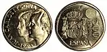 | 25 песет | 1957 (58, 59, 61, 64-75) | медно-никелевый сплав [Cu75Ni25] | 26,50 | 8,50 | 2,10 | Изображение Ф. Франко, («FRANCISCO FRANCO CAUDILLO DE ESPAÑA POR LA G. DE DIOS»), внизу год «1957», по кругу бусовый ободок | Герб Испании, вверху справа номинал «25/PTAS», внизу слева 6-конечная звезда с годом чеканки, по кругу бусовый ободок | * UNA *|* GRANDE *|* LIBRE *|* |