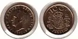 | 100 песет | 1966 (67-70) | серебро [Ag80Cu20] | 34,00 | 19,00 | 2,30 | Изображение Ф. Франко, («FRANCISCO FRANCO CAUDILLO DE ESPAÑA POR LA G. DE DIOS»), внизу год «1966», по бокам от него 6-конечные звезды с годом чеканки | Элементы герба Испании, вверху «100», справа «PTAS» | * UNA *|* GRANDE *|* LIBRE *|* |