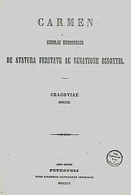 - Nicolai Hussoviani. Carmen de statura feritate ac venatione bisontis. Cracoviae, MDXXIII.