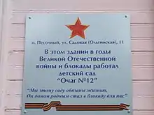 Детский садик для маленьких блокадников был открыт в 1942 году на Садовой улице, 11. В годы войны в его стенах не погиб ни один ребёнок. Всех выходили воспитательницы. В память об этом 5 октября 2009 года от бывших воспитанников установлена мемориальная доска. «Садик был круглосуточный, дети жили в нём два года, а потом, после снятия блокады, их перевели на ул. Торфяную, а в садик стали привозить истощённых детей из Ленинграда. Их здесь поднимали на ноги»[6].
