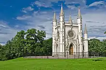 В 1825 году земли к востоку от Нижнего парка император Николай I приобретает и дарит своей жене Александре Фёдоровне, и они получают название «Собственная Её величества дача Александрия». С 1826 года архитектор А. А. Менелас разбивает здесь пейзажный парк, строит двухэтажный дворец Коттедж. В 1830—1831 годах в парке строится Фермерский дворец, а в 1835 году — Готическая капелла (архитектор К. Шинкель)[13]