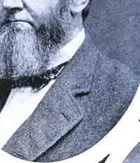 Белый цветок в петлице на левом лацкане пиджака.