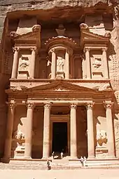 Знаменитый скальный храм-мавзолей, «Сокровищница фараона», как называют её арабы. Точное назначение сооружения до конца не выяснено. Есть предположение, что первоначально это был храм богини Исиды. Во всяком случае, многие черты памятника говорят о том, что его могли построить мастера, знакомые с приёмами зодчества Александрии Египетской.