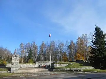У входа на мемориал расположена площадка первого уровня, вымощенная брусчаткой, с левой стороны которой установлена стела из темно- серых гранитных блоков с датами гибели советских воинов «1939-1940» «1941 - 1944», с правой стороны флагшток и скамья.