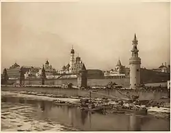 В 1861 году в Петровской башне вновь проводилась реставрация при участии архитектора Петра Герасимова. В результате ремонта были перелицованы машикули и парапет, на обходной площадке обновили лещадь, а шатёр покрыли новой черепицей[31] Спустя 21 год у башни исправили цоколь из белого камня, провели ремонт обвалившейся кирпичной кладки. В конце XIX века у башни со стороны Москвы-реки по-прежнему пролегали бульвар и набережная, а на территории Кремля располагался Дровяной двор Большого дворца[32].