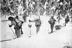 | Финские лыжники-разведчики на задании во время Великой Отечественной войны | Вид на холм Хижгора, на обратном склоне которого 11 февраля 1942 года располагался лагерь финского диверсионного отряда, атаковавшего госпиталь в посёлке Петровский Ям | Медперсонал госпиталя ППГ 2212, врачи, медсестры, санитары расстрелянные финскими диверсантами из сводного отряда Хонканена | Стреляная гильза от пистолета-пулемёта Suomi, найденная на месте госпиталя ППГ 2212 |