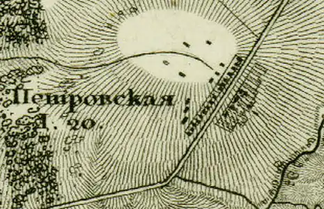 ПЕТРОВСКАЯ — деревня владельческая при реке Чёрной, на Гостилицком просёлочном тракте, в 13½ верстах от Петергофа, число дворов — 17, число жителей: 60 м п., 94 ж. п. (1862 год)[8]