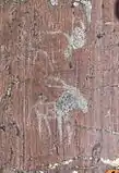 Особенно стоит отметить изображения колесниц в специфичной для Северной Евразии «распластанной» проекции. Всего описано более 80 рисунков.[4] Такой тип передачи объекта характерен для наскальных рисунков горно-степной зоны Евразии эпохи бронзы.