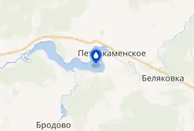 В селе Петрокаменском расположена восточная часть пруда, где он приобретает наибольшую ширину. Юго-западная часть села образует полуостров, где к берегу Петрокаменского пруда выходят улицы Трактористов и Набережная. Сам полуостров обращён на юго-восток, а пруд в данной местности огибает его, меняя русло реки приблизительно на 90°, на север.[4]