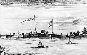 Проект Петропавловской крепости задумал лично сам царь Пётр I[9]. Первые её планы составлены в 1703 году саксонским инженером В. А. Кирштенштейном и французским инженером Ж. Г. Ламбером де Гереном[10] Крепость была заложена 16 (27) мая 1703 года. Эту дату принято считать днём основания Санкт-Петербурга, ставшего вскоре столицей Российской империи. 29 июня, в Петров день, заложили деревянную церковь святых апостолов Петра и Павла, отметив событие пальбой из пушек. Церковь имела две башни со шпицами, обрамляющими вход. Строительство крепости велось очень быстро. В сооружении были заняты находившиеся на работах в Шлотбурге и Шлиссельбурге солдаты и рабочие. В июле на строительство пришли сосланные на берега Невы рабочие из других городов по царскому указу. К осени 1703 года на тяжёлых земляных работах насчитывалось уже несколько тысяч рабочих. На них же возложили обязанность валить лес для строительства. 19 августа произошло первое наводнение[7][11].
