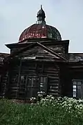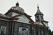 - Колокольня на входе на кирпичном основании. Сделана из бревен средней величины «в обло». Четверик по высоте сходится с основным объёмом храма, но колокольня всё же является вертикальной доминантой за счёт использования шатрового завершения с маленькой луковичной главкой, поставленного на вытянутый восьмерик, образуя традиционную для русской архитектуры композицию «восьмерик на четверике». Над каждой из восьми его граней сделаны небольшие декоративные кокошники, причем над широкими гранями, совпадающими со сторонами света поставлены, соответственно, ложные закомары больше, чем над угловыми секциями. Этот простой прием создает динамичное восприятие храма.