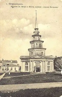Храм был деревянным, выполнен в европейском, «новоманерном» стиле и в общих чертах повторял одноимённый Петропавловский собор в Санкт-Петербурге, состоял из пяти ярусов с тёсовыми крышами. По периметру четырёх нижних ярусов были устроены балюстрады с деревянными перилами. Под шпилем с крестом ночью зажигался фонарь, служивший маяком находившимся на озере лодкам и судам.