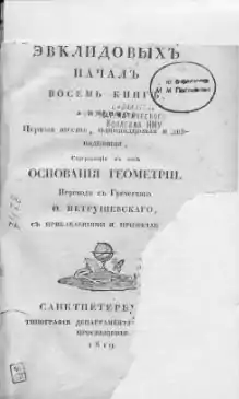 - Эвклид. Эвклидовых начал восемь книг, а именно: первые шесть, одиннадцатая и двенадцатая, содержащие в себе основания геометрии / Пер. с греч. Ф. Петрушевского с прибавлениями и примеч. — СПб.: тип. Департамента народного просвещения, 1819. — 480 с.